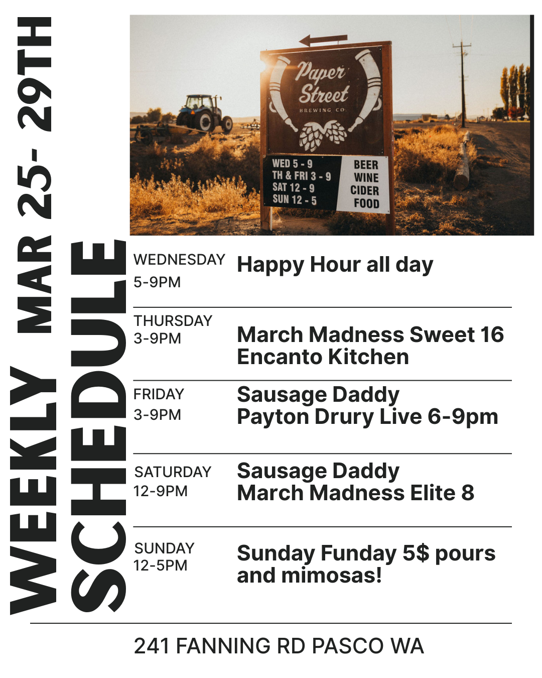 Paper Street Brewing is a family run brewery located 2.5 miles north of the highway in West Pasco. The brewery is open Wednesday thru Sunday and is placed in the middle the farm country in Block 1 with an awesome indoor outdoor venue welcome to the entire family. Come out and try some of our great beers, tri cities sunshine, rotating food trucks and the best atmosphere around!